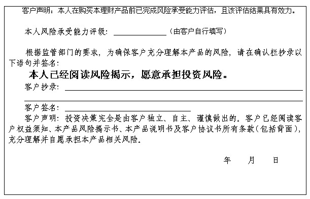 在您签署《中国建设银行股份有限公司理财产品客户协议书》前,应当仔细阅读客户权益须知、本风险揭示书及本产品的产品说明书的全部内容,同时向中国建设银行了解本产品的其他相关信息,并自己独立做出是否认(申)购本产品的决定。