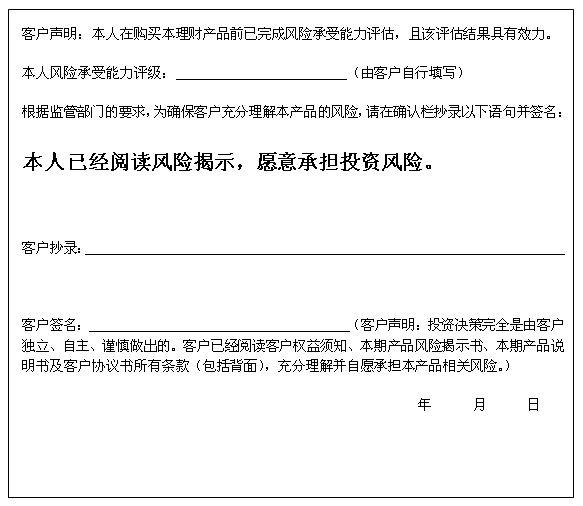高资产净值客户请在下面填写您的风险承受能力评级、抄录风险揭示语句并签字: